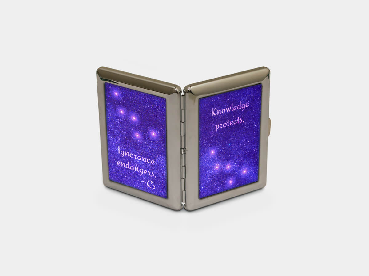 Amidst the stars is the shiny constellation Cassiopaea, overlain with a profound four-word quote that reminds us of the importance of acquiring knowledge versus the pitfalls of remaining ignorant.